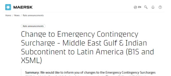 Maersk anunciou ajustes ao seu Surcharge de Contingência de Emergência (ECS) para remessas de carga do Golfo do Oriente Médio e do subcontinente indiano para a América Latina.