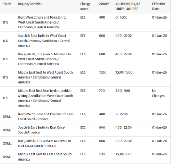 A revisão se aplica a várias rotas comerciais servidas pelas rotas B1S e X5ML, incluindo carga originária do Noroeste da Índia e do Paquistão, do Sul e do Leste da Índia, Bangladesh, Sri Lanka, Maldivas e do Golfo do Oriente Médio, destinadas a locais ao longo das costas leste e oeste da América do Sul, do Caribe e da América Central.